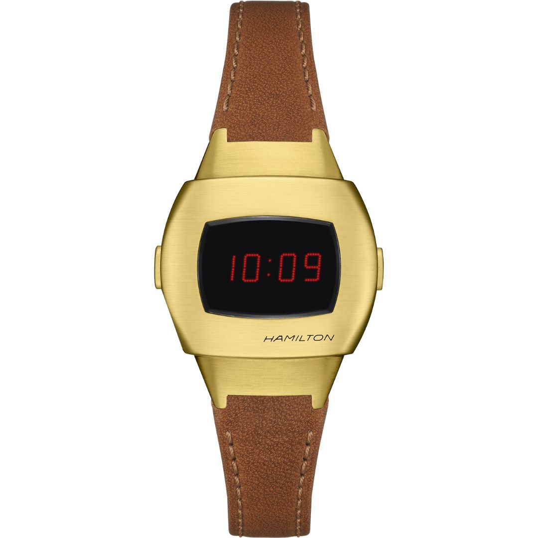 The Hamilton American Classic PSR 74 Digital Quartz H52314530 pairs a yellow gold PVD cushion-shaped case with a black digital display. Featuring a hybrid LCD and OLED quartz movement, it fuses vintage digital heritage with modern sophistication—ideal for collectors who appreciate timeless innovation and refined everyday style.