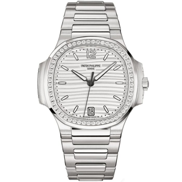 The Patek Philippe Nautilus 7118/1200A-010 blends feminine elegance with iconic design. A diamond-set bezel frames the silver opaline dial, while a stainless steel bracelet adds sophistication. Powered by Caliber 324 S C, it offers precision, 45-hour power reserve, and timeless everyday luxury.