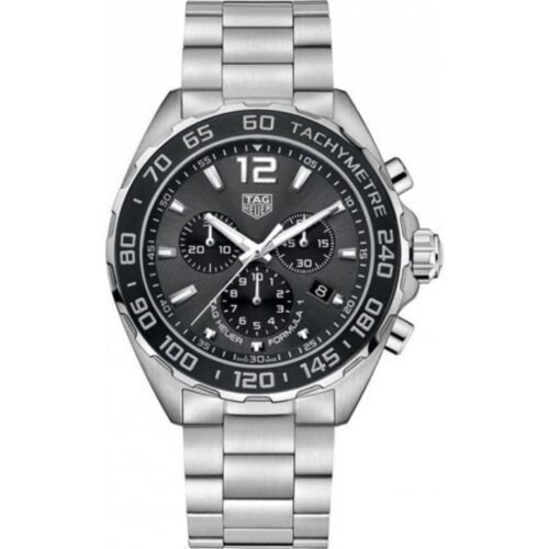 The Tag Heuer Formula 1 Chronograph CAZ1011.BA0843 pairs a robust stainless steel and ceramic bracelet with a sleek grey dial. Powered by a precise quartz movement, it offers sophisticated chronograph timing, merging high-performance motorsport functionality with undeniable luxury prestige.