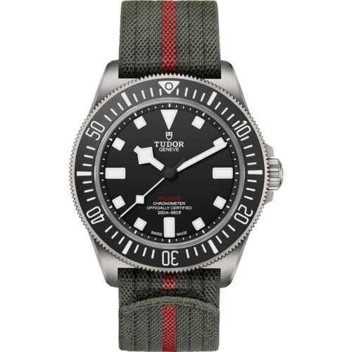 The Tudor Pelagos FXD M25717N-0001 features a lightweight titanium case and a distinctive green textile strap. Powered by the COSC-certified Manufacture Caliber MT5602, this robust diving instrument embodies Tudor’s heritage of creating professional-grade tool watches for modern exploration.