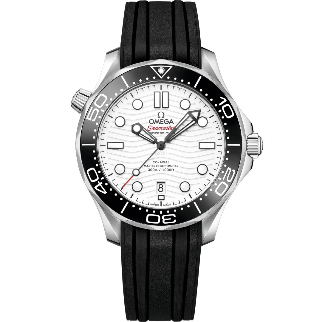 The Omega Seamaster Diver 300M 210.32.42.20.04.001 combines bold design with professional-grade performance. Its 42mm stainless steel case is paired with a black ceramic bezel featuring a diving scale, while the white dial showcases laser-engraved wave patterns. Fitted with a durable black rubber strap, it offers exceptional comfort and resilience. Powered by a self-winding movement and water-resistant to 300 meters, it is built for precision and underwater adventure. This watch comes complete with the original box and papers.