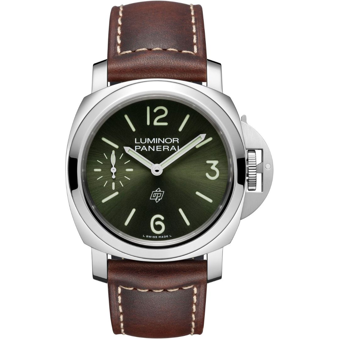 Panerai Luminor Logo 44mm PAM01624 is a bold expression of Italian design and Swiss craftsmanship. Housed in a 44mm stainless steel case, it features a striking green sunburst dial with small seconds for balanced functionality. Powered by a reliable manual-winding movement, it is paired with a dark brown leather strap, delivering classic Luminor character with timeless versatility and everyday presence on the wrist. This watch comes complete with the original box and papers.