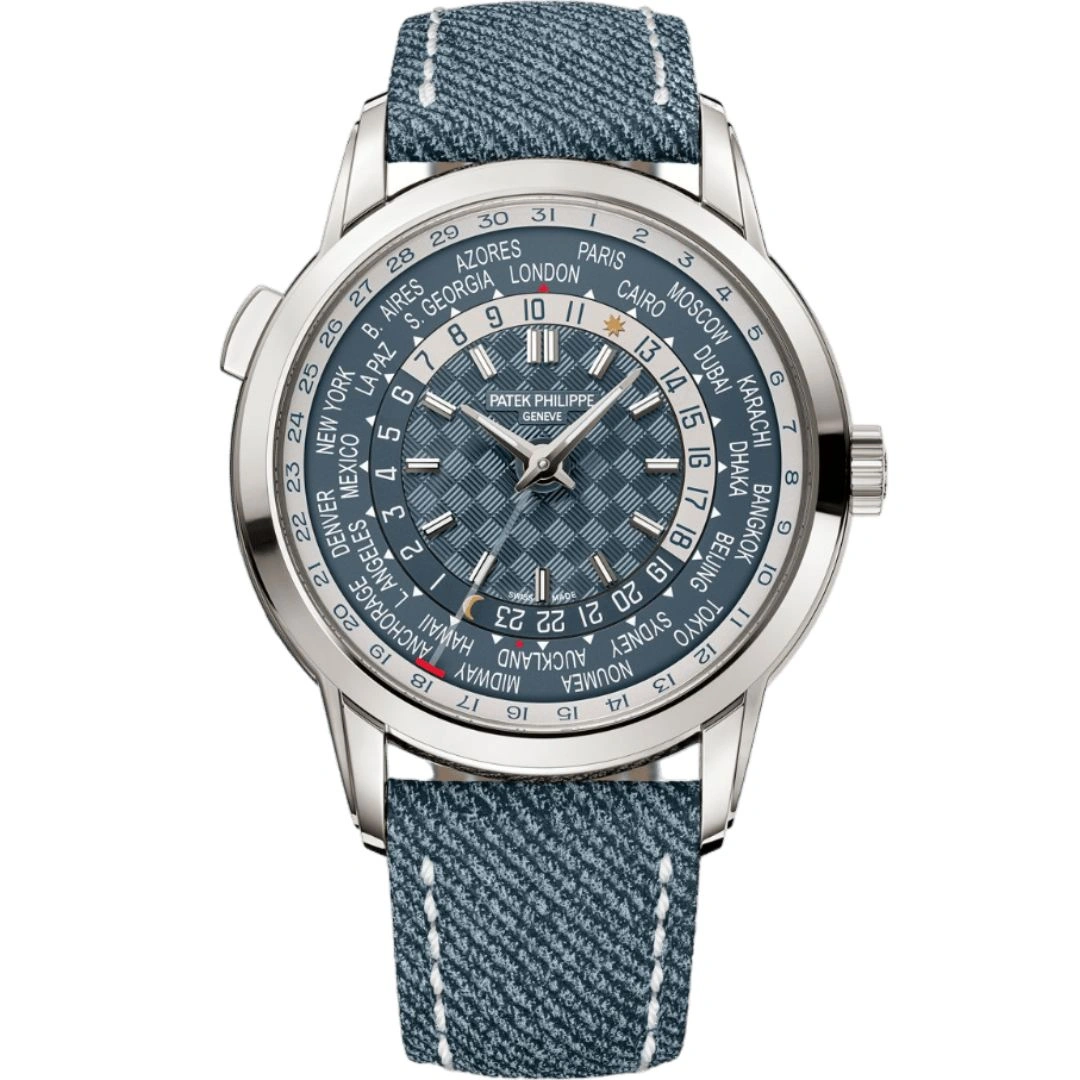 Pre-Owned Patek Philippe World Time Date 5330G-001 combines modern style with global functionality. Its 40mm 18k white gold case frames a striking blue-gray dial with a “carbon” pattern. Driven by a self-winding movement, it displays multiple time zones alongside an innovative date synchronized to local time. The denim-pattern leather strap adds a contemporary touch, while 30m water resistance ensures everyday versatility and refined practicality worldwide. This watch comes complete with the original box and papers.